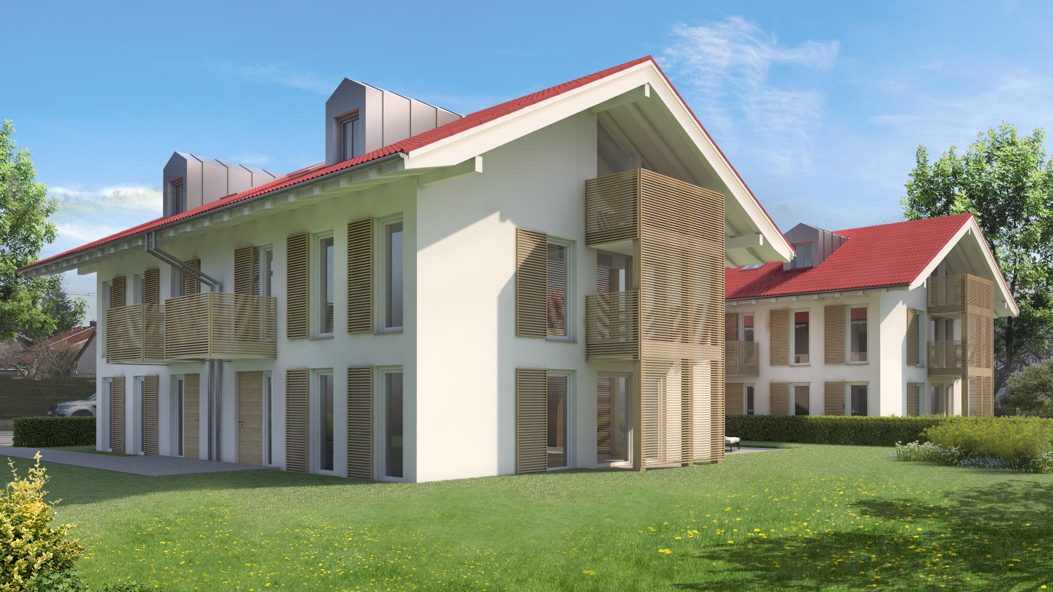 Die durchdachten Grundrisse bestechen im Erdgeschoss durch einen offenen Küchenbereich, ein großes Wohn- und Esszimmer sowie ein Gästebad mit Dusche. Das Obergeschoss verfügt über drei Schlafzimmer, allesamt mit Balkonen und ein zentral platziertes Badezimmer mit Dusche und Badewanne samt Bergblick.
