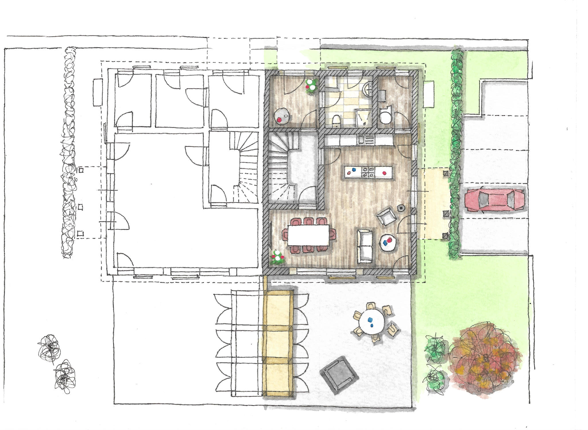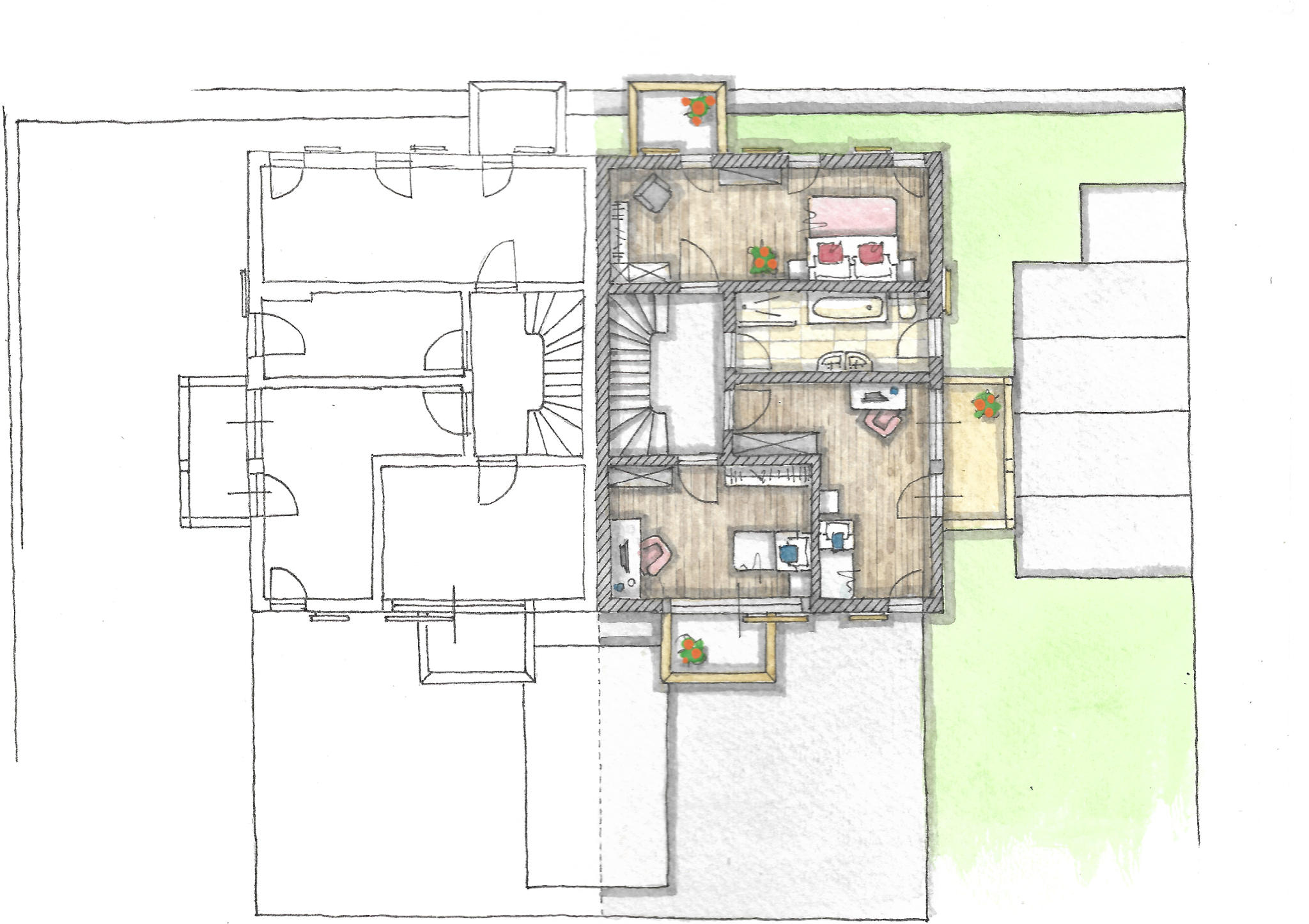 Besonderes Highlight ist das Studio im Dachgeschoss, welches durch seine Gauben und die extravagante Glasfront ein Refugium für Eltern oder kreatives Arbeiten bietet.