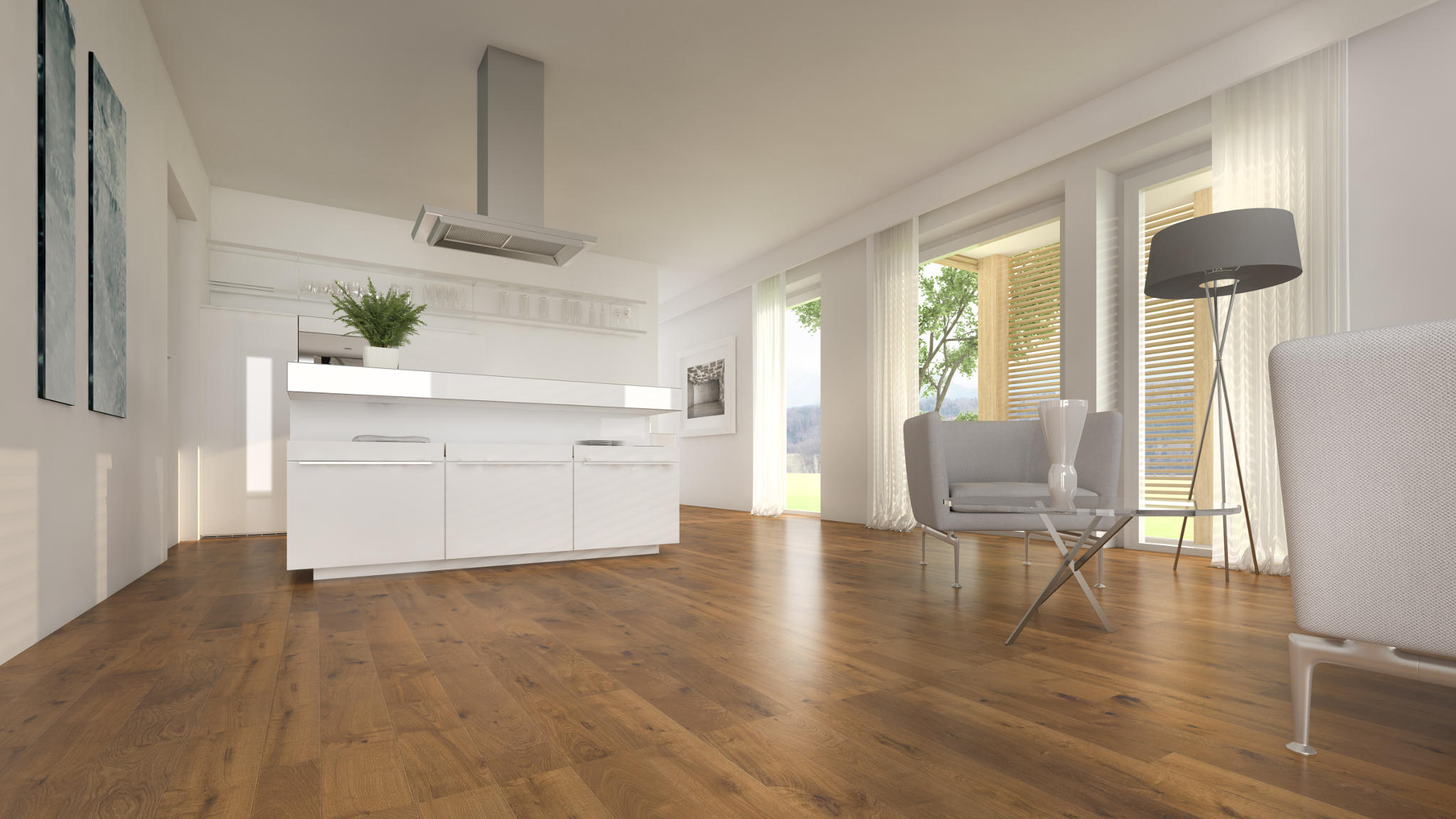 Premium-Böden mit Landhausdielen 2,2 m (Bernsteineiche Sauvage strukturiert) und großformatigen Feinsteinfliesen in Bädern und Speisekammer | |