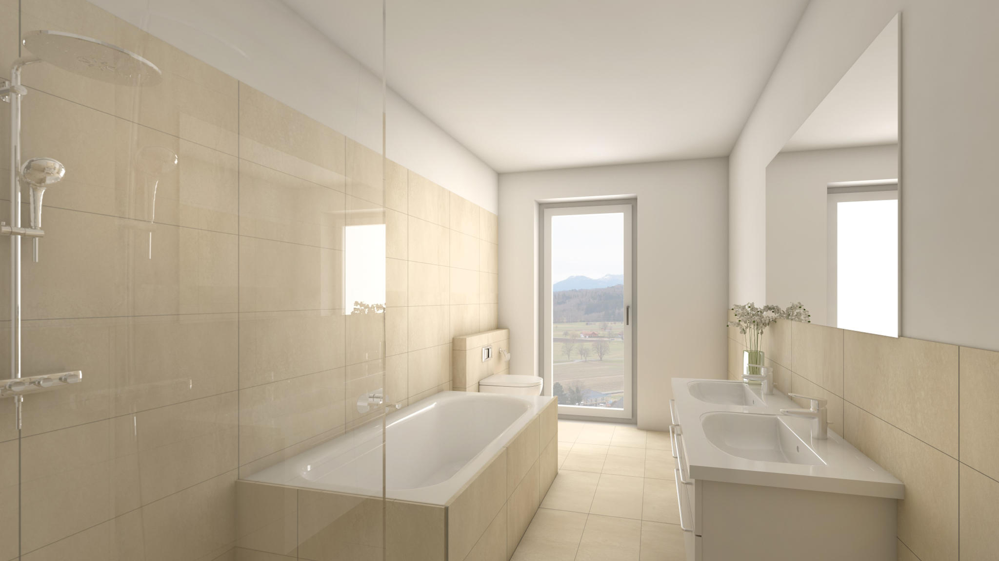 2 Bäder mit bodenebenen Duschen und Zweisitzer-Badewanne | |